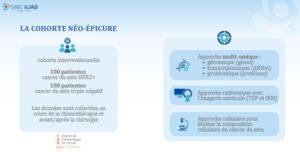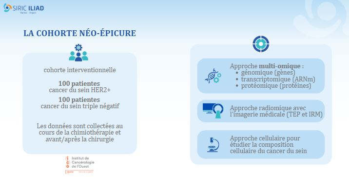 Néo-épicure est un essai clinique initié en 2023 à l’Institut de Cancérologie de l’Ouest par le professeur Jean-Sébastien Frenel, à l’occasion de la seconde labellisation du SIRIC ILIAD. Actuellement en cours de constitution, il vise à inclure 200 patientes, dont 100 touchées par un cancer du sein HER2+ et 100 autres atteintes d’un cancer du sein triple négatif. Des données cliniques et des prélèvements biologiques sont collectés tout au long de la prise en charge des patientes : lors (i) du traitement par chimiothérapie néoadjuvante*, (ii) de l’intervention chirurgicale et (iii) du suivi jusqu’à 5 ans après la chirurgie.